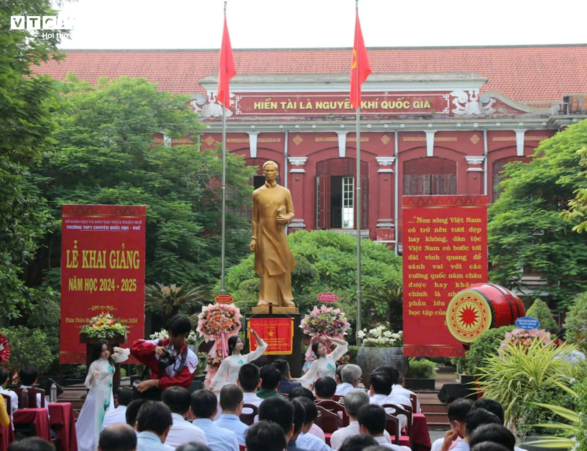 Các học sinh trường THPT chuyên Quốc học Huế tề tựu dưới tượng đài Nguyễn Tất Thành (Chủ tịch Hồ Chí Minh thời trẻ) để tổ chức lễ khai giảng năm học mới 2024 - 2025.