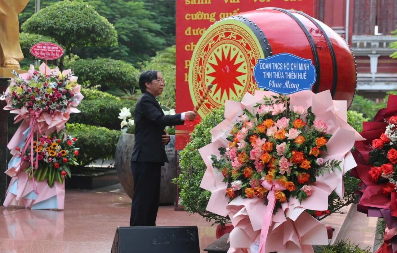Ông Nguyễn Phú Thọ, Hiệu trưởng trường THPT chuyên Quốc học Huế đánh trống khai giảng năm học 2024-2025