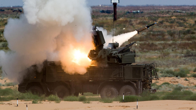 Hệ thống tên lửa phòng không Pantsir-S của Nga khai hỏa. Ảnh: Bộ Quốc phòng Nga