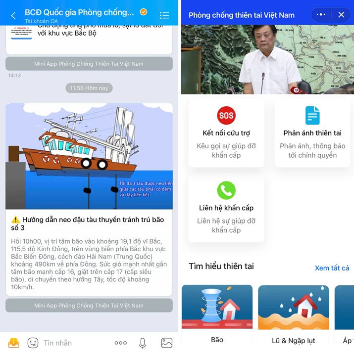 Ra mắt từ năm 2023, Zalo Mini App “Phòng chống thiên tai Việt Nam" do Văn phòng Thường trực Ban Chỉ đạo Quốc gia về Phòng, chống thiên tai phối hợp với Quỹ Nhi đồng Liên Hợp Quốc (UNICEF) phát hành đã đồng hành cùng người dân cả nước đi qua nhiều thiên tai và biến động thời tiết. Zalo Mini App “Phòng chống thiên tai Việt Nam" giúp người dân an tâm hơn khi có thêm công cụ hỗ trợ khẩn cấp, đối phó với những diễn biến phức tạp của thiên tai.