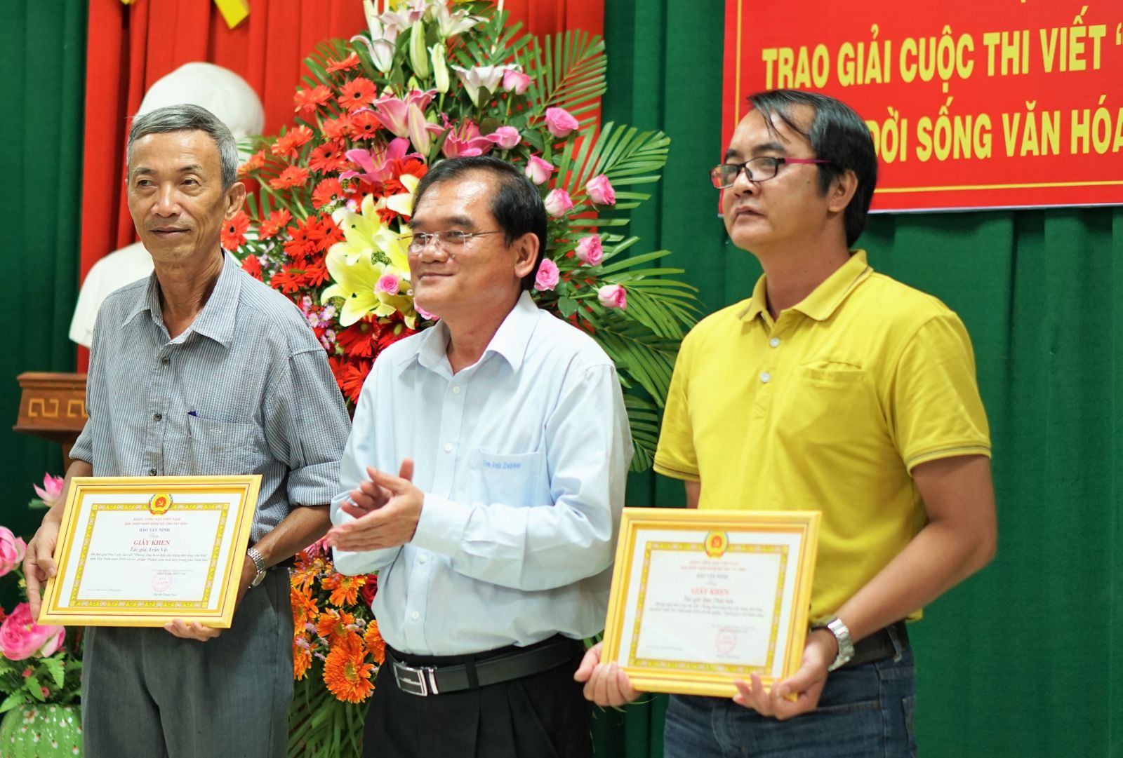 Phó Bí thư Thường trực Tỉnh ủy Nguyễn Minh Tân trao giấy khen cho các tác giả đạt giải cuộc thi viết “Phong trào toàn dân đoàn kết xây dựng đời sống văn hóa” tỉnh Tây Ninh.