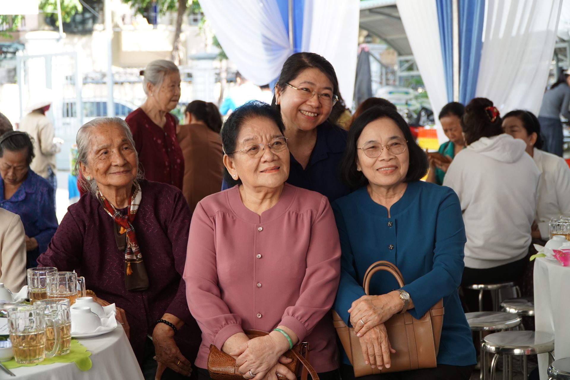 Các nguyên Bí thư Tỉnh uỷ bà Nguyễn Thị Minh (áo hồng) và bà Lê Thị Bân (áo xanh) tham dự buổi họp mặt.