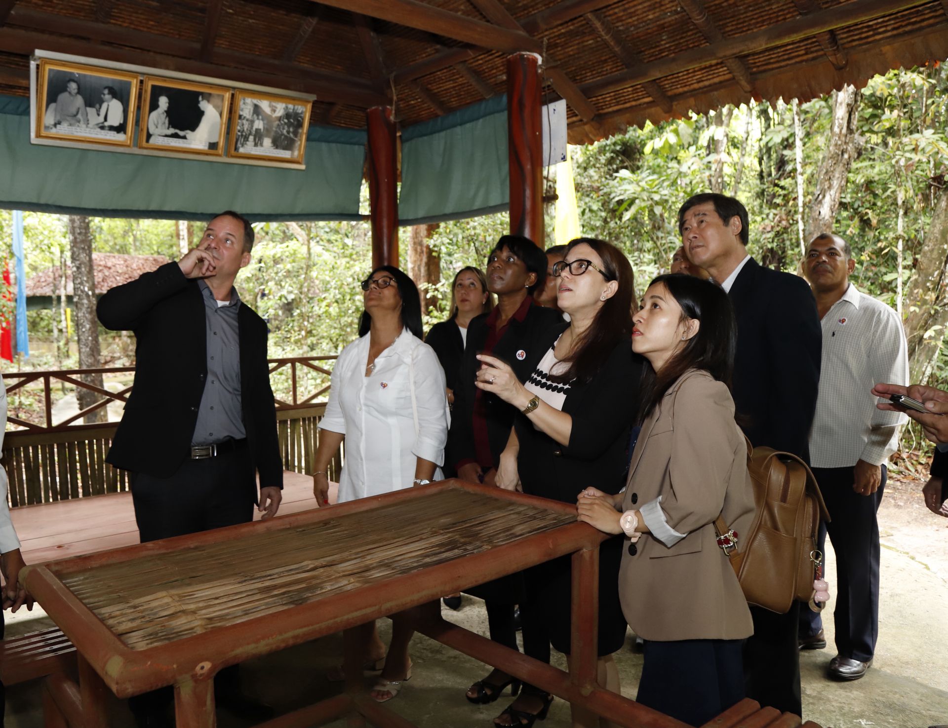 Các thành viên trong của Lãnh sứ quán Cuba tại TP. Hồ Chí Minh và lãnh đạo tỉnh Tây Ninh chụp ảnh lưu niệm tại Căn cứ Chính phủ Cách mạng lâm thời Cộng hoà miền Nam Việt Nam