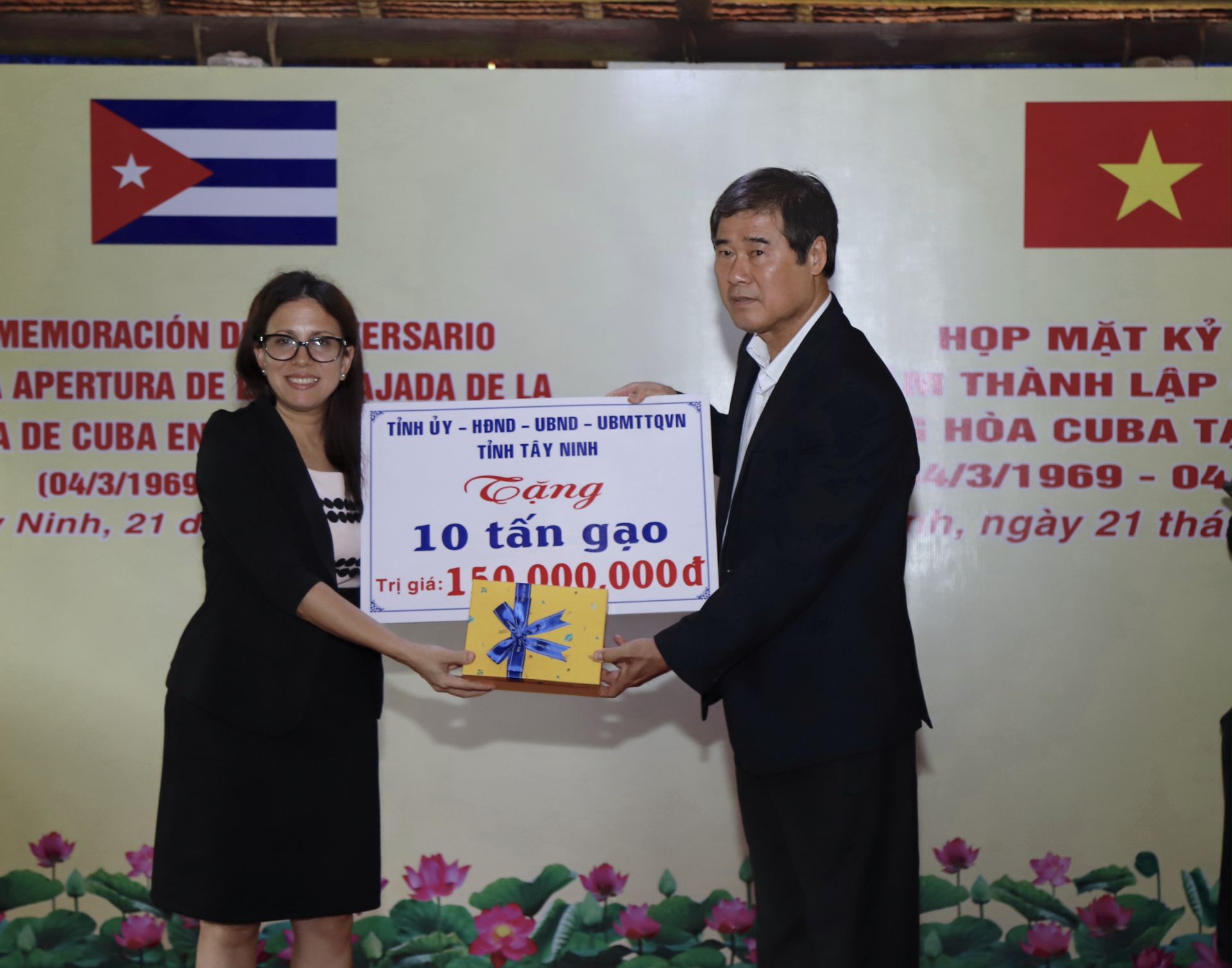 Nhân buổi họp mặt ôn lại kỷ niệm 55 năm thành lập Đại sứ quán Cuba tại tỉnh Tây Ninh, lãnh đạo Tây Ninh gửi đến đoàn quà tặng lưu niệm và hỗ trợ 10 tấn gạo trị giá 150 triệu đồng gửi đến người dân Cuba.