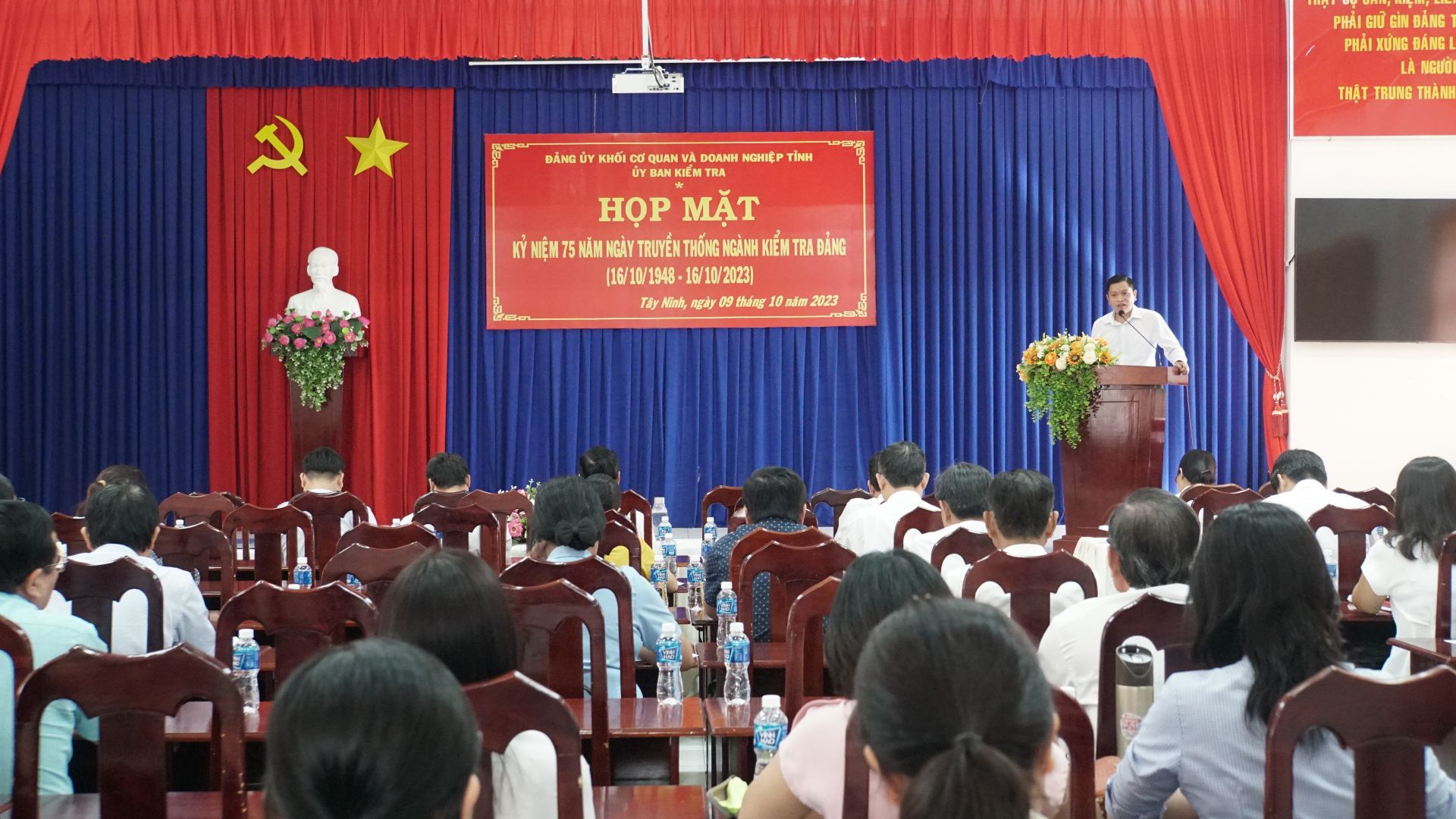 Chiều 9.10, Uỷ ban Kiểm tra (UBKT) Đảng uỷ khối Cơ quan và Doanh nghiệp (CQ&DN) tỉnh tổ chức họp mặt kỷ niệm 75 năm Ngày truyền thống ngành Kiểm tra Đảng 16.10.1948 - 16.10.2023. Tham dự có đại diện UBKT Tỉnh uỷ, Thường trực Đảng uỷ khối CQ&DN tỉnh.