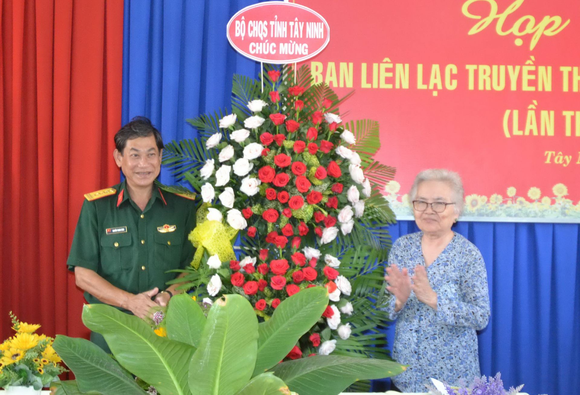 Đại tá Nguyễn Thanh Hùng- Phó Chỉ huy trưởng Bộ CHQS tặng hoa chúc mừng Ban liên lạc truyền thống Quân y Tây Ninh nhân buổi họp mặt