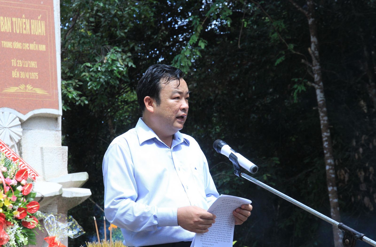 Cán bộ ngành Tuyên giáo Tây Ninh thắp hương tưởng niệm tại Bia Tuyên huấn Trung ương Cục miền Nam.