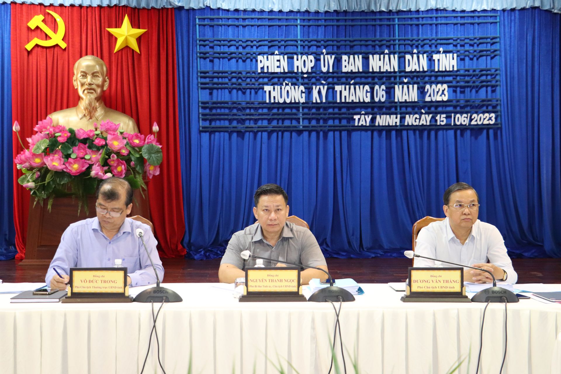 Sáng 15.6, UBND tỉnh tổ chức phiên họp thường kỳ tháng 6.2023 cho ý kiến một số nội dung quan trọng. Chủ tịch UBND tỉnh Nguyễn Thanh Ngọc cùng Phó Chủ tịch Thường trực UBND tỉnh Võ Đức Trong, Phó Chủ tịch Dương Văn Thắng đồng chủ trì phiên họp.