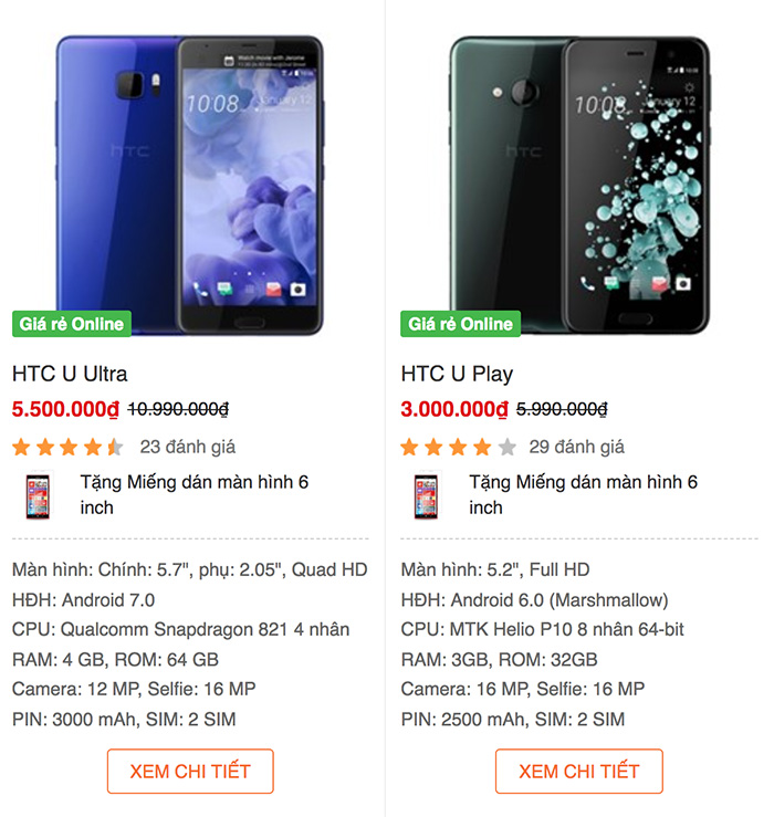 Cụ thể, HTC U Ultra Play được giảm giá từ 6 triệu xuống chỉ còn 3 triệu đồng. HTC U Ultra cũng có giá sốc không kém khi giảm 50%, từ 11 triệu xuống chỉ còn 5,5 triệu đồng.