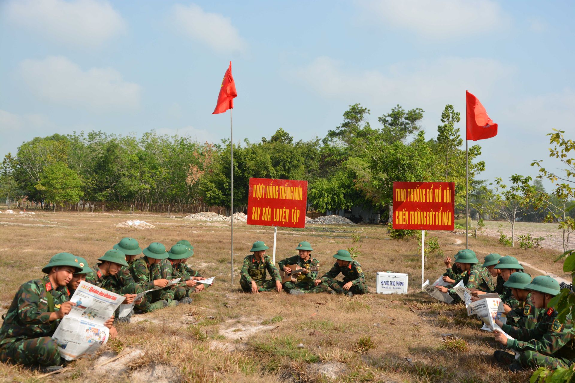 Chiến sĩ Đại đội 40, Ban CHQS huyện Châu Thành trong giờ giải lao trên thao trường huấn luyện.
