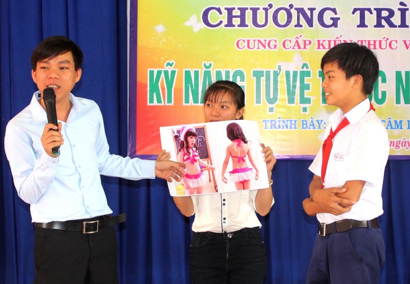| Thạc sĩ Lê Minh Huân hướng dẫn học sinh phân biệt những vùng riêng tư trên cơ thể. |