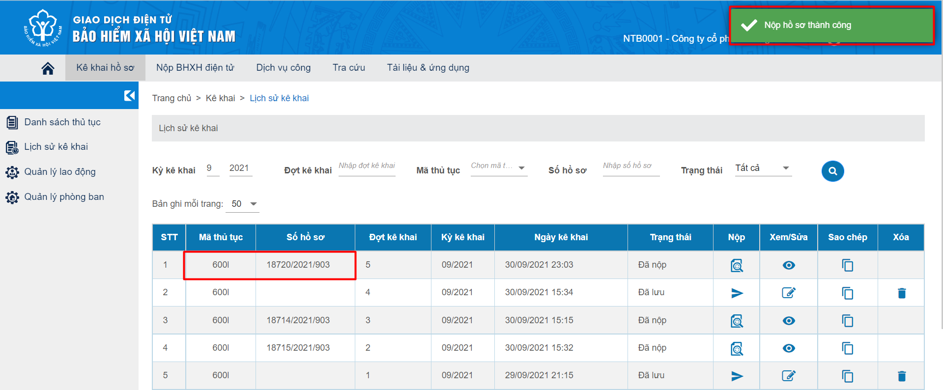 Sau khi thực hiện xác nhận thành công, hệ thống sẽ thông báo nộp hồ sơ thành công. Như vậy là hồ sơ của NLĐ đã được gửi đến cơ quan BHXH thành công.
