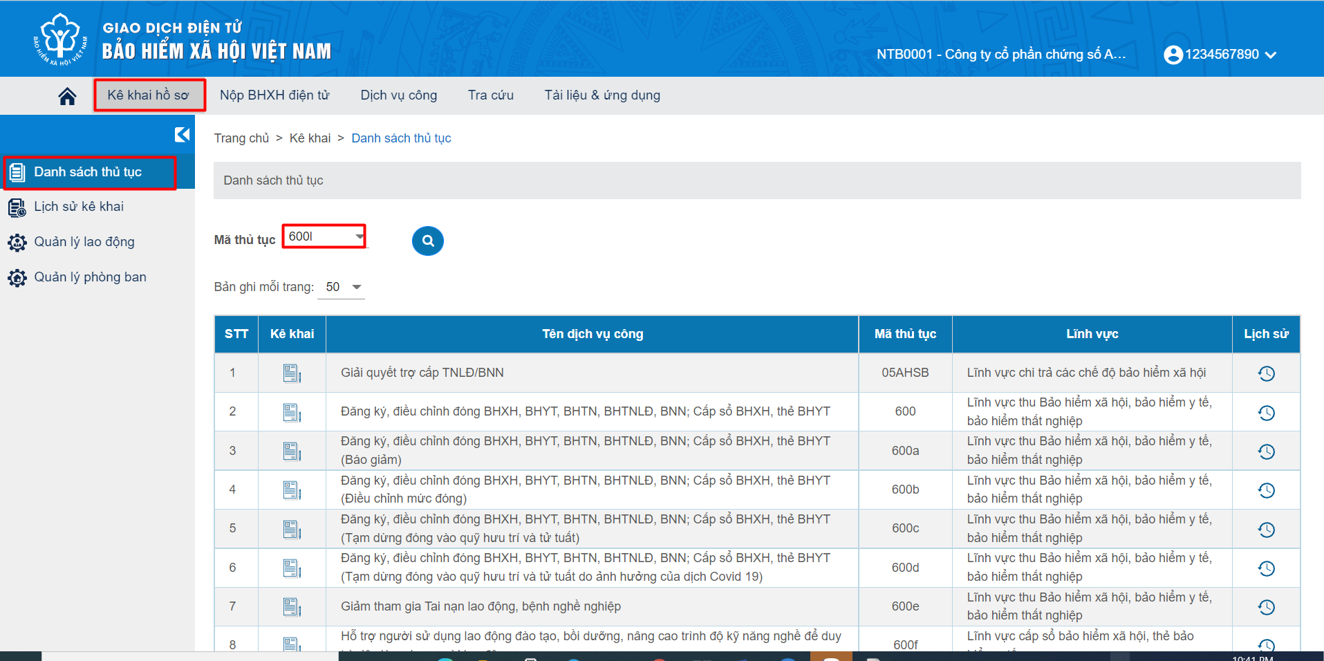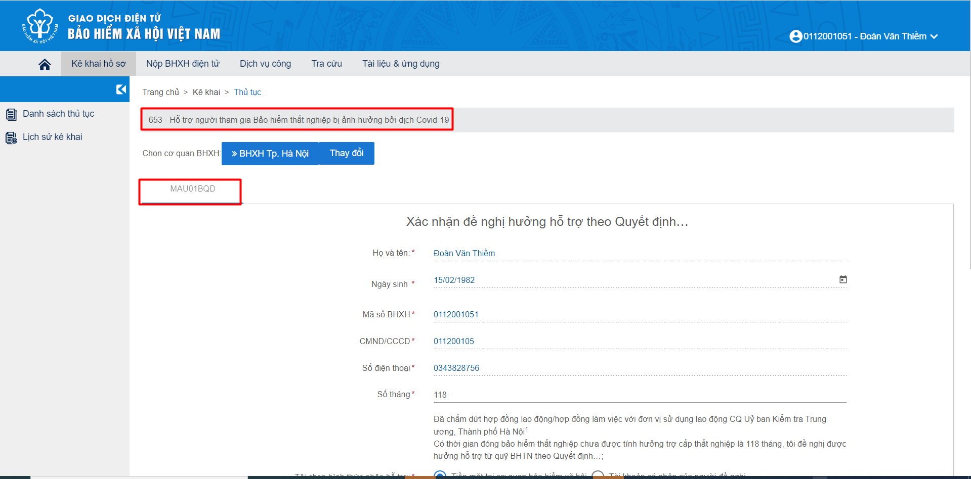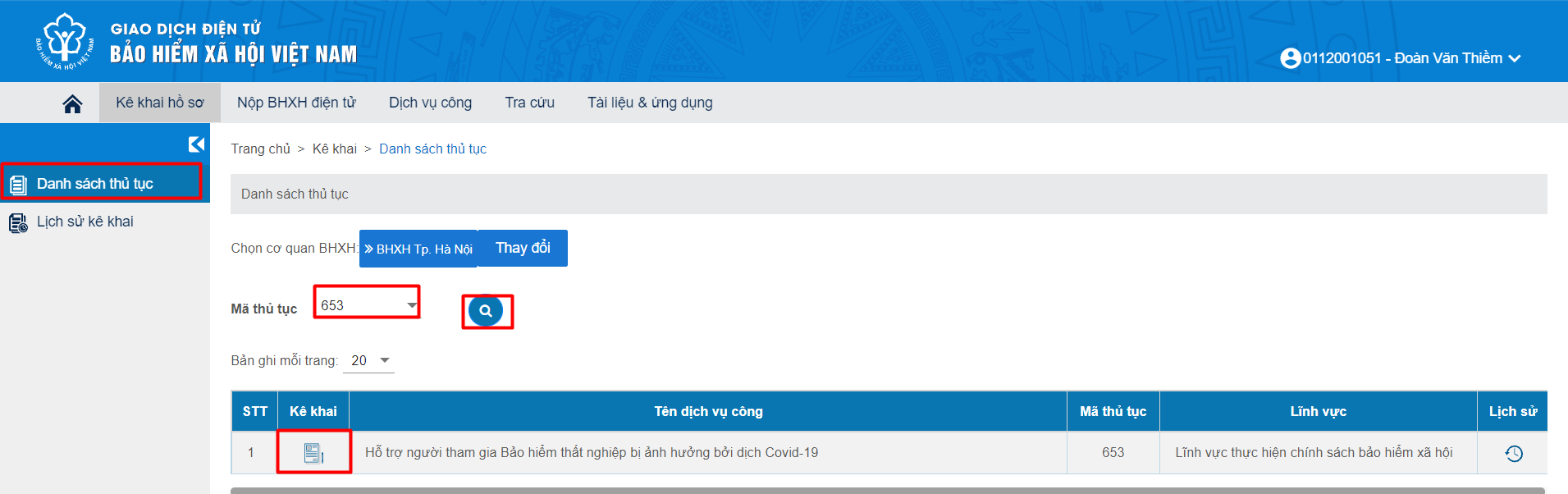 Bước 3: Tại màn hình: “Danh sách thủ tục”, chọn mã thủ tục “653 - Hỗ trợ người tham gia BHTN bị ảnh hưởng bởi dịch Covid-19” và chọn Kê khai.