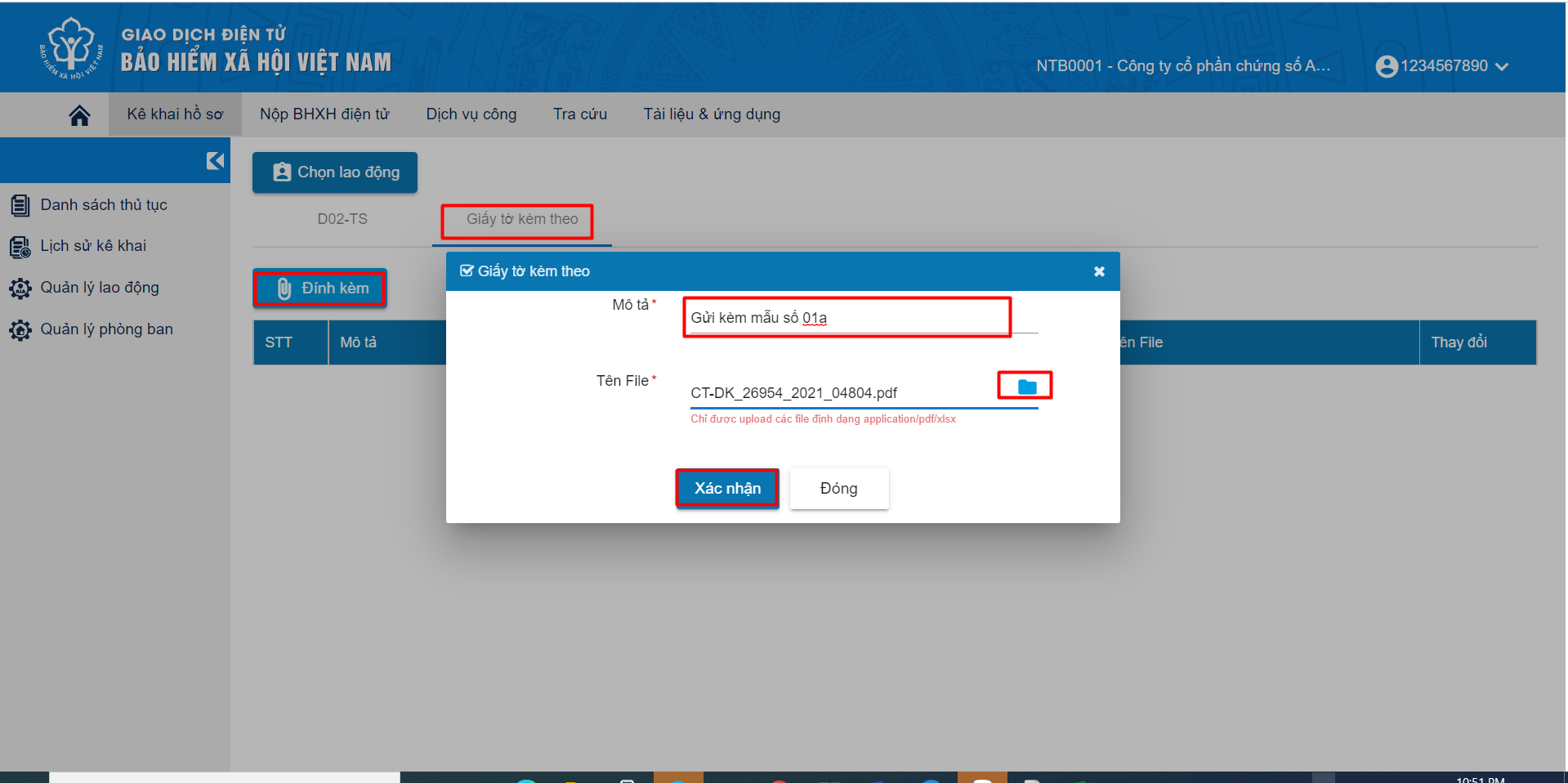 Bước 5: Thực hiện gửi kèm mẫu số 01 như hình sau và chọn Xác nhận.