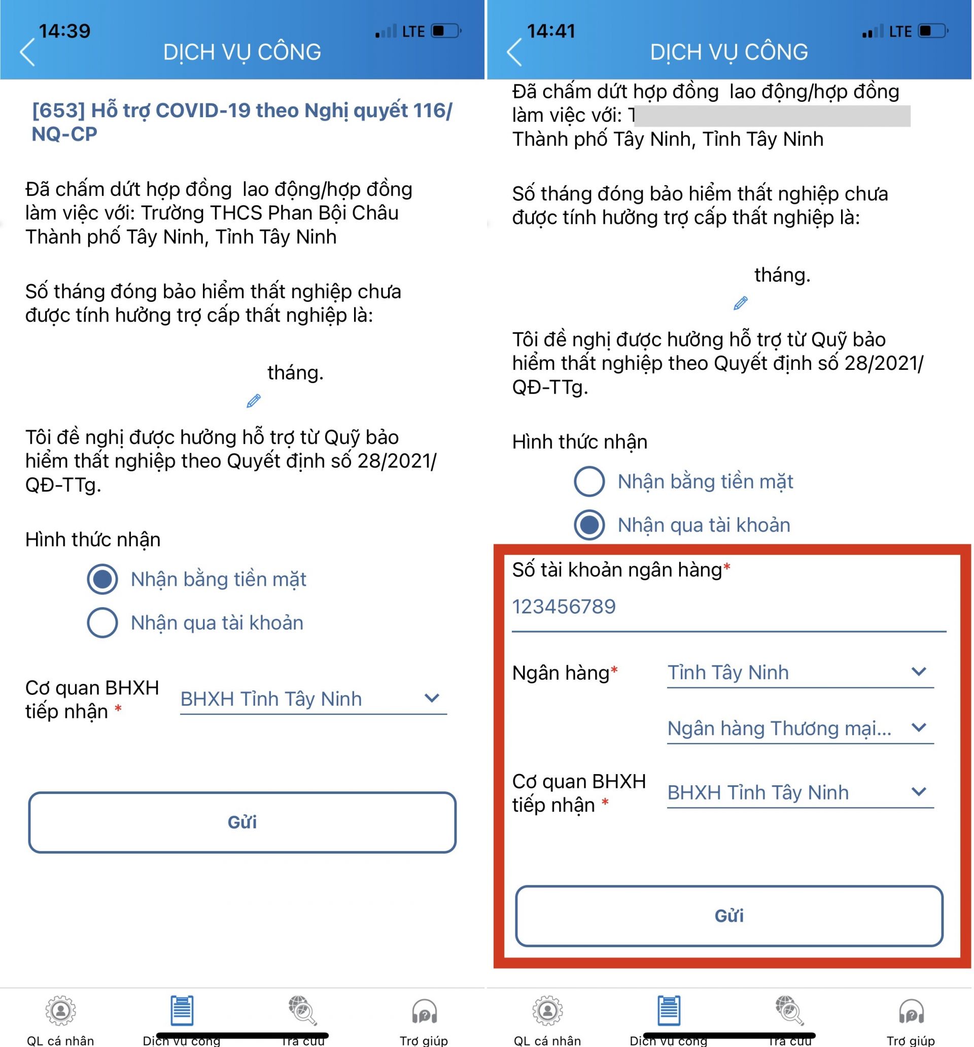 + Số tài khoản của người đề nghị nhận hỗ trợ.