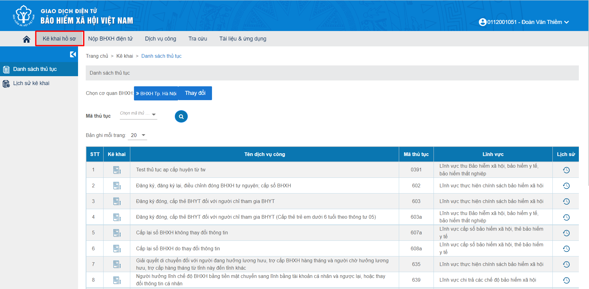 Bước 2: Chọn mục “Kê khai hồ sơ”, màn hình hiển thị danh sách các dịch vụ công để kê khai như sau: