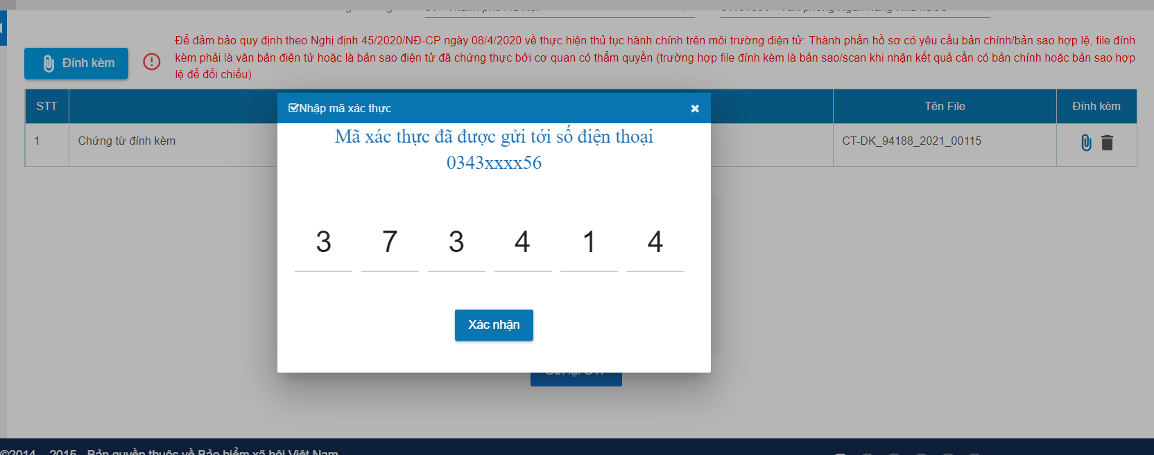 Bước 7: Nhập mã OTP, bấm Xác nhận để gửi hồ sơ.