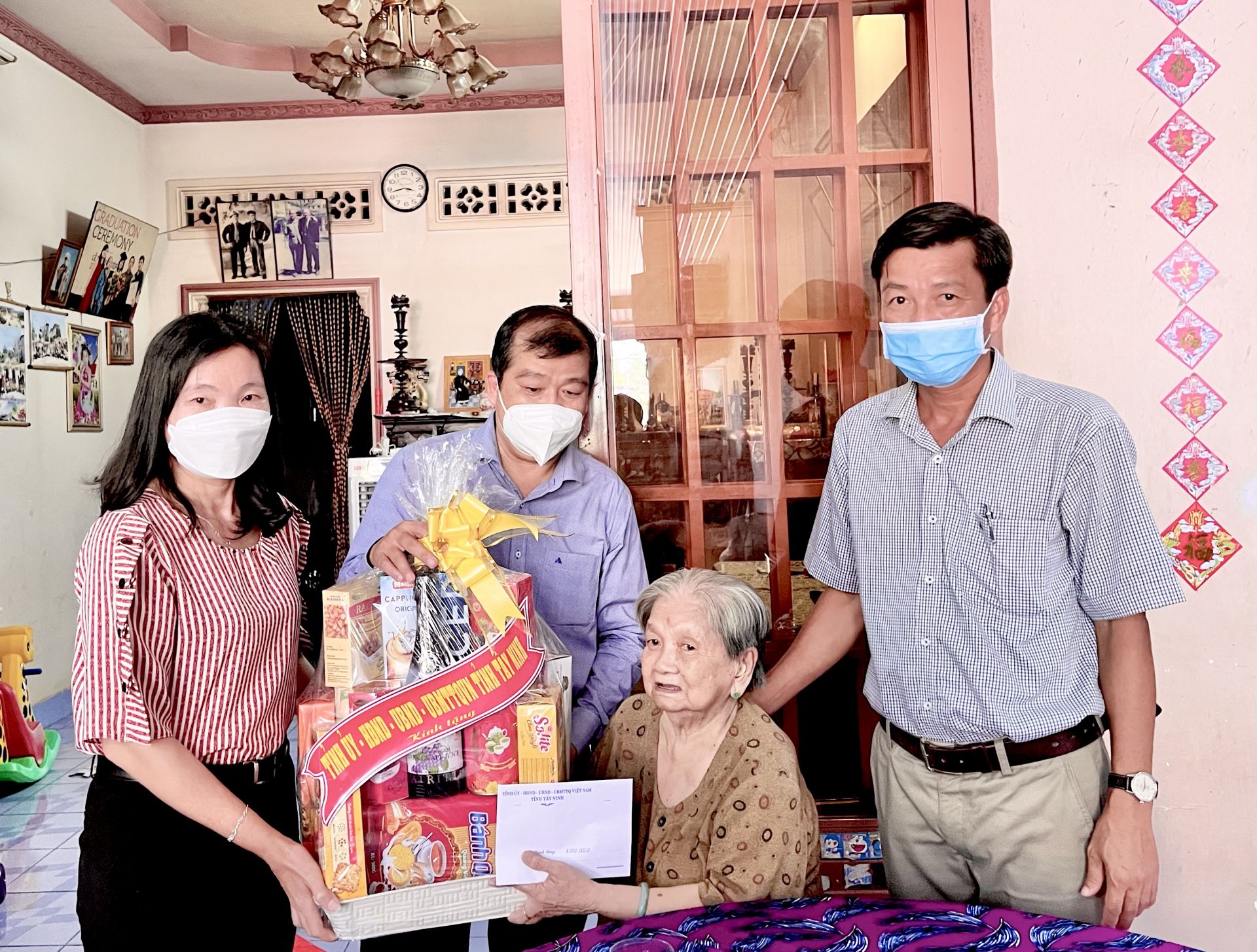 Ông Võ Đức Trong- Phó Chủ tịch Thường trực UBND tỉnh (đứng giữa) cùng lãnh đạo huyện Châu Thành thăm, tặng quà Mẹ VNAH tại xã Đồng Khởi.