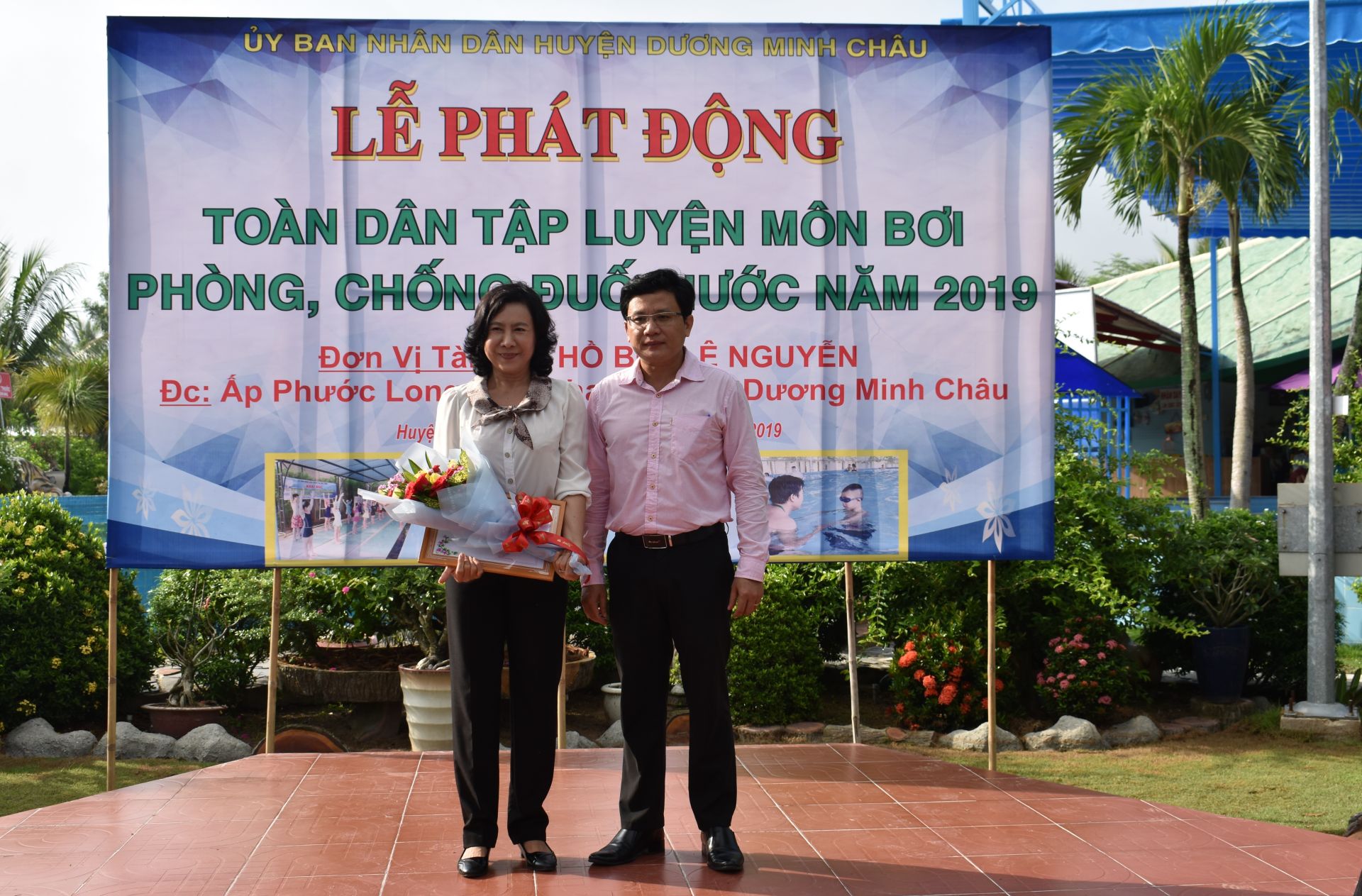 Ông Nguyễn Hoài Phương- Phó Chủ tịch UBND huyện Dương Minh Châu trao hoa và thư cảm ơn cho đại diện hồ bơi Lê Nguyễn.