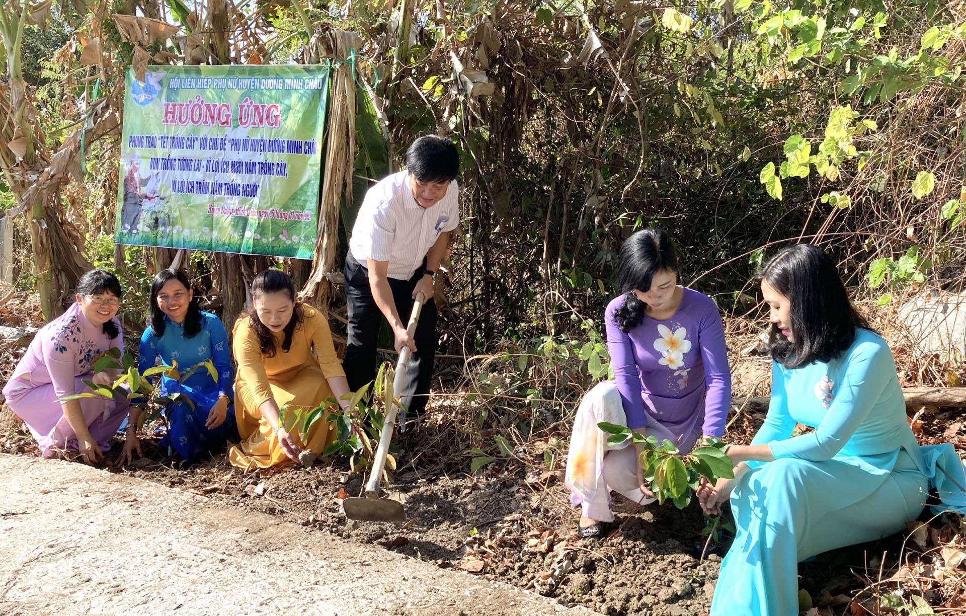 Ông Nguyễn Hồng Sơn- Bí thư Huyện ủy cùng đại diện Hội LHPN huyện trồng cây ăn quả.
