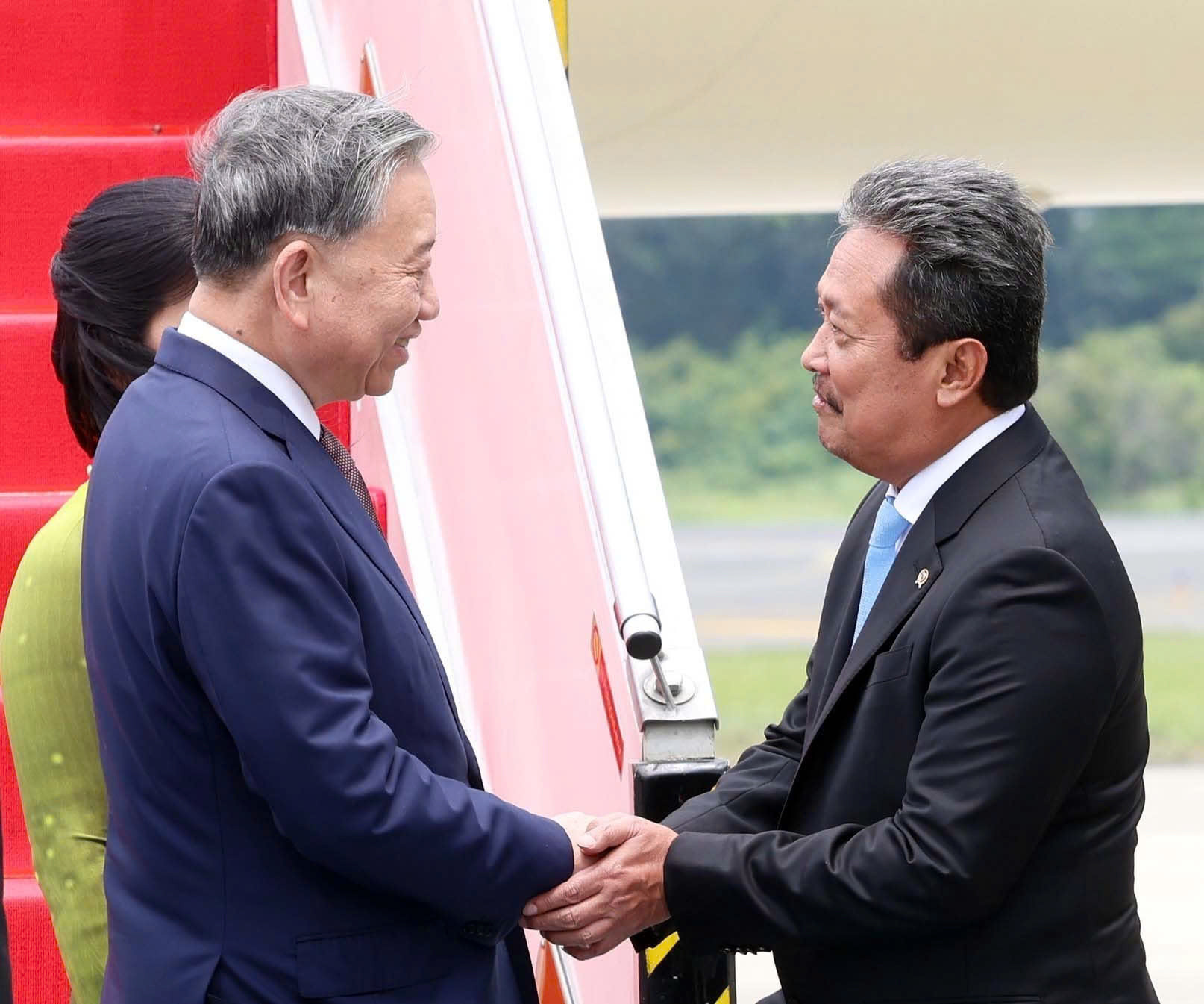 Tổng Bí thư Tô Lâm và Phu nhân từ trên máy bay bước xuống thảm danh dự, đi giữa hai hàng tiêu binh, dừng lại trước quốc kỳ hai nước và cúi chào; bắt tay các quan chức Indonesia và đại diện phía Việt Nam ra đón.