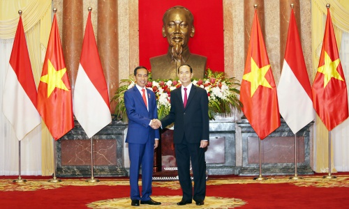 Tổng thống Indonesia Widodo, trái, và Chủ tịch nước Trần Đại Quang trong cuộc gặp hôm nay. Lâm Thoả.