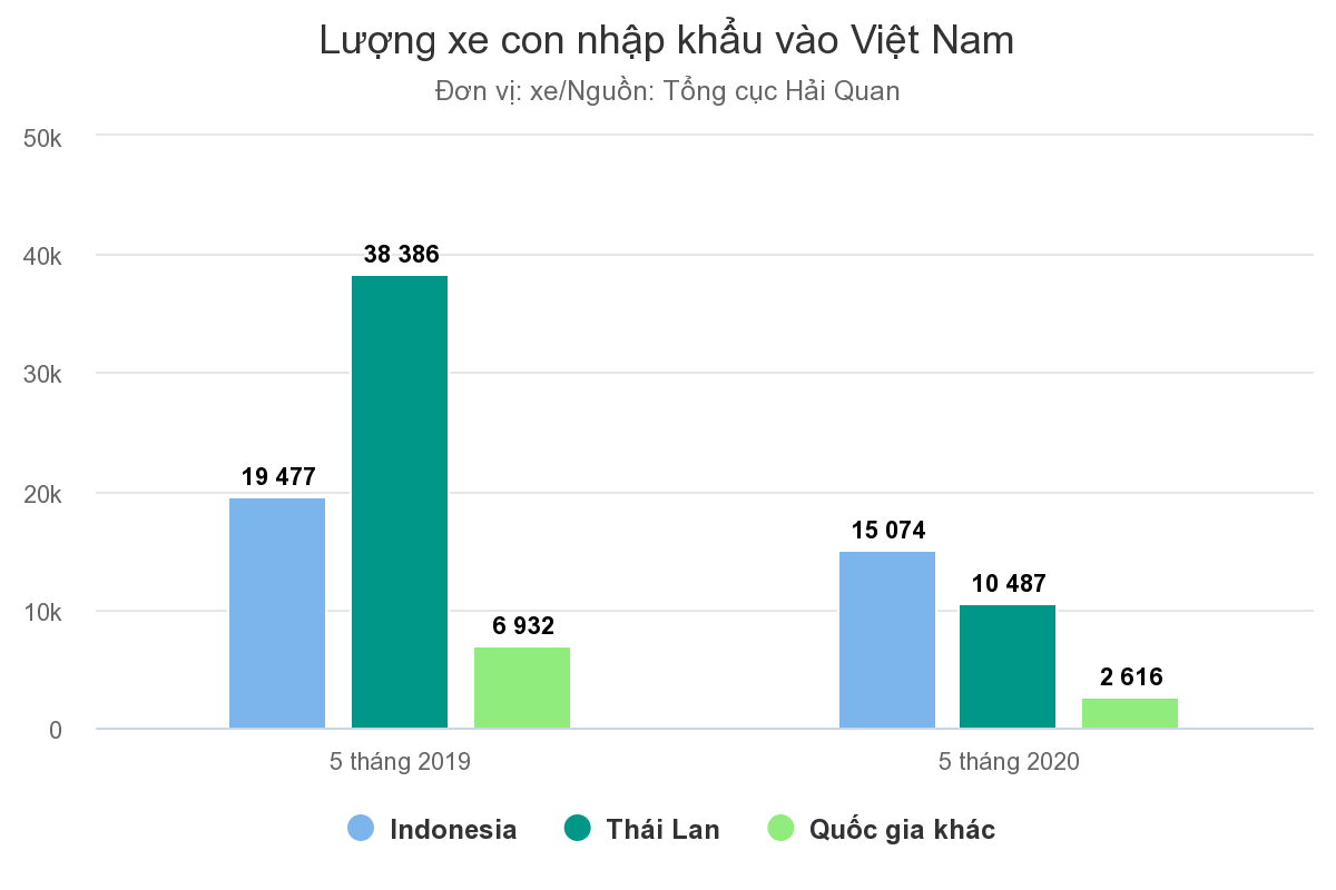 Thống kê của Tổng cục Hải quan, Việt Nam nhập khẩu tổng 36.798 ôtô các loại trong 5 tháng đầu 2020, riêng xe con là 28.523 xe. Indonesia trở thành nước xuất khẩu nhiều xe con nhất sang Việt Nam với 15.074 xe. Thái Lan mất ngôi số một khi dừng ở mức 10.487 xe.