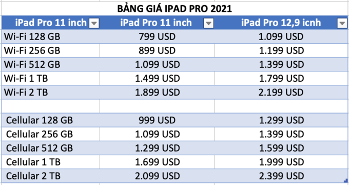 iPad 11 Pro 2021 bản tiêu chuẩn dùng màn hình 11 inch, kết nối Wi-Fi, bộ nhớ trong 128 GB có giá 799 USD, tương đương giá iPad Pro 2020. Trong khi phiên bản cao cấp nhất dùng màn hình 12,9 inch, hỗ trợ 5G, bộ nhớ trong 2 TB giá 2.399 USD.