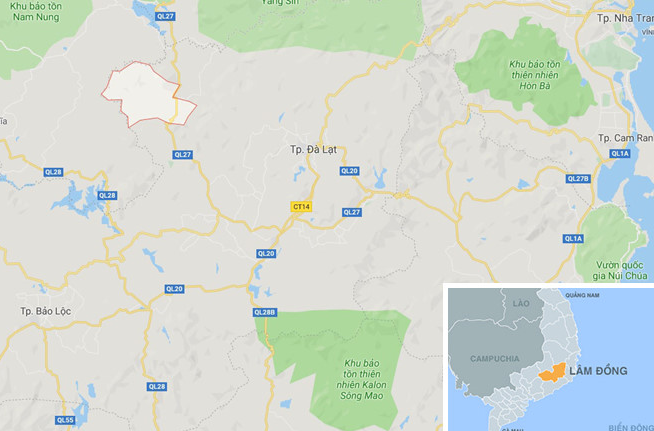 Xã Liêng Srônh (khoanh đỏ) - nơi xảy ra sự việc. Ảnh: Google Maps.