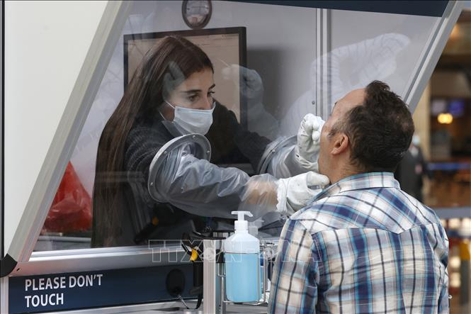 Nhân viên y tế lấy mẫu xét nghiệm COVID-19 cho hành khách tại sân bay quốc tế Ben Gurion ở Lod, Israel. Ảnh tư liệu: AFP/TTXVN
