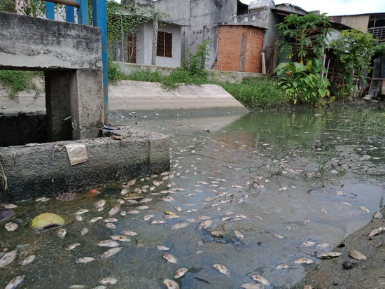 Cá chết hàng loạt, nguồn nước bẩn bốc mùi tại một cống ngang kênh TN11 (gần cổng chào khu du lịch Long Điền Sơn).