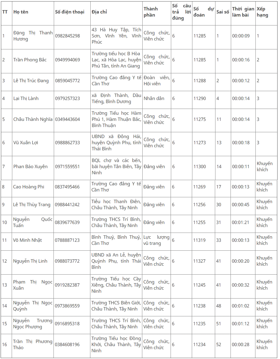 Danh sách thí sinh đạt giải Cuộc thi Cuộc thi tìm hiểu “Đảng bộ tỉnh Tây Ninh qua Mười kỳ Đại hội” trên Internet và mạng xã hội Tháng 9.2020:
