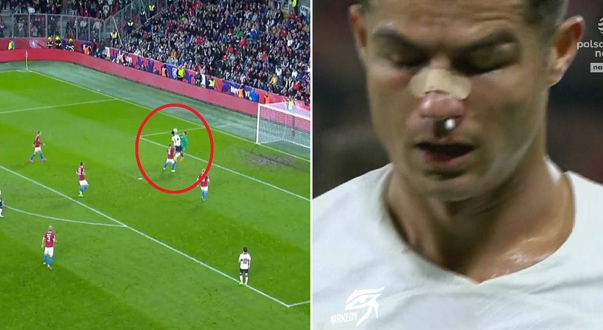 Cristiano Ronaldo đã có hiệp 1 đen đủi khi Bồ Đào Nha tới làm khách của CH Czech. CR7 đổ máu sau pha va chạm với thủ môn Tomas Vaclik ở phút 13 và bị VAR xác định dùng tay chơi bóng dẫn tới quả phạt đền ở phút 45+5.