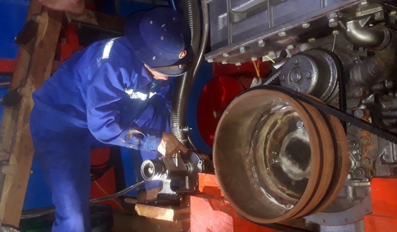 Các thợ sửa chữa của TTHC-KT đảo Sinh Tồn khắc phục sự cố bơm làm mát máy phát điện