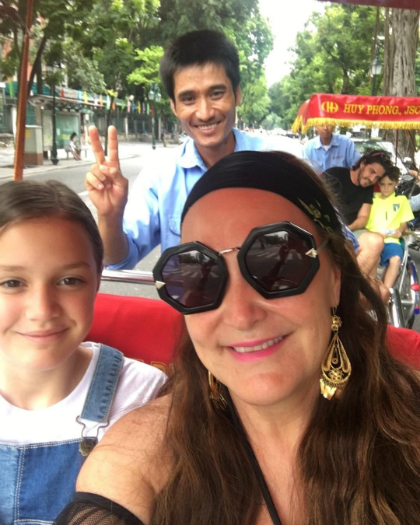 Kate cùng gia đình dạo chơi bằng xích lô tại Hà Nội hôm 13/7. Ảnh: Kate Langbroek.