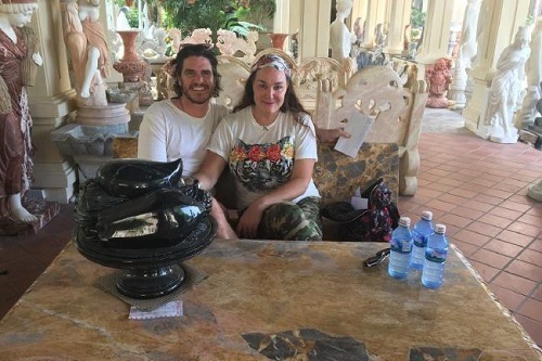 Vợ chồng Kate tại Đà Nẵng cùng ảnh chụp mẫu tượng đá họ đặt. Ảnh: KIIS FM.