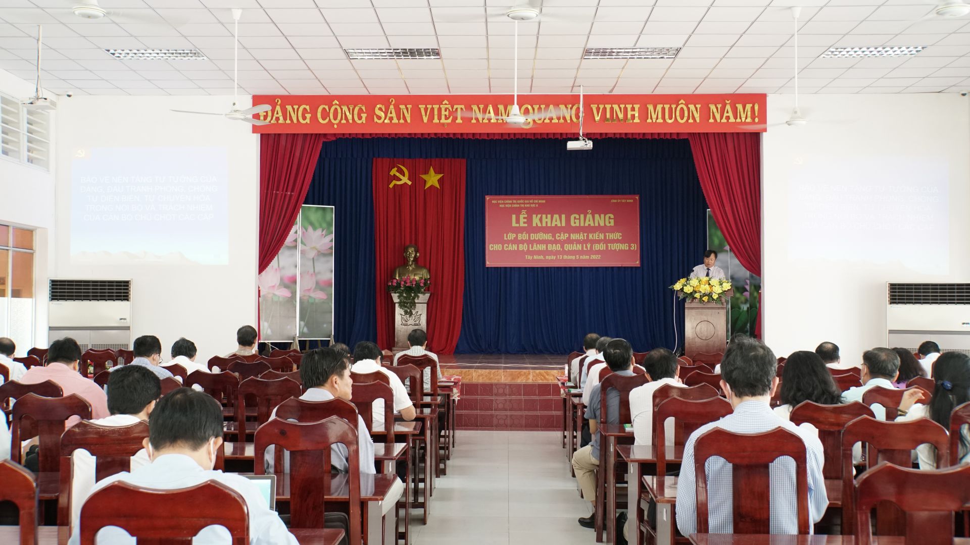 Sáng 13.5, tại trường Chính trị tỉnh diễn ra lễ khai giảng lớp bồi dưỡng, cập nhật kiến thức cho cán bộ lãnh đạo, quản lý (đối tượng 3). Dự lễ khai giảng có Phó Bí thư Thường trực Tỉnh uỷ, Trưởng Đoàn ĐBQH tỉnh Phạm Hùng Thái; PGS.TS Nguyễn Quốc Dũng - Giám đốc Học viện Chính trị khu vực II.