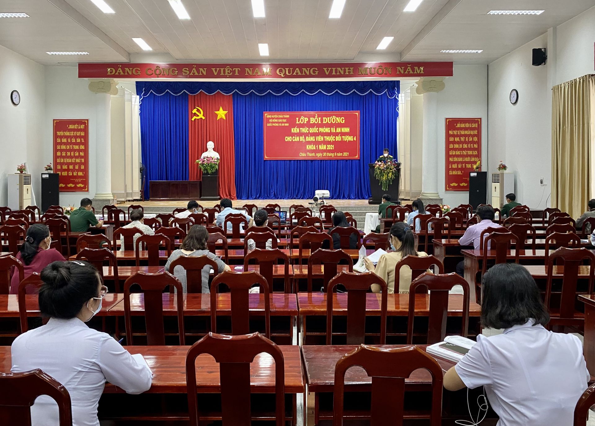 Sáng 30.9, Hội đồng giáo dục quốc phòng và an ninh huyện Châu Thành khai giảng lớp bồi dưỡng kiến thức quốc phòng, an ninh cho đối tượng 4 năm 2021. Lớp học được tổ chức hình thức trực tuyến tại điểm cầu huyện và 15 xã, thị trấn.