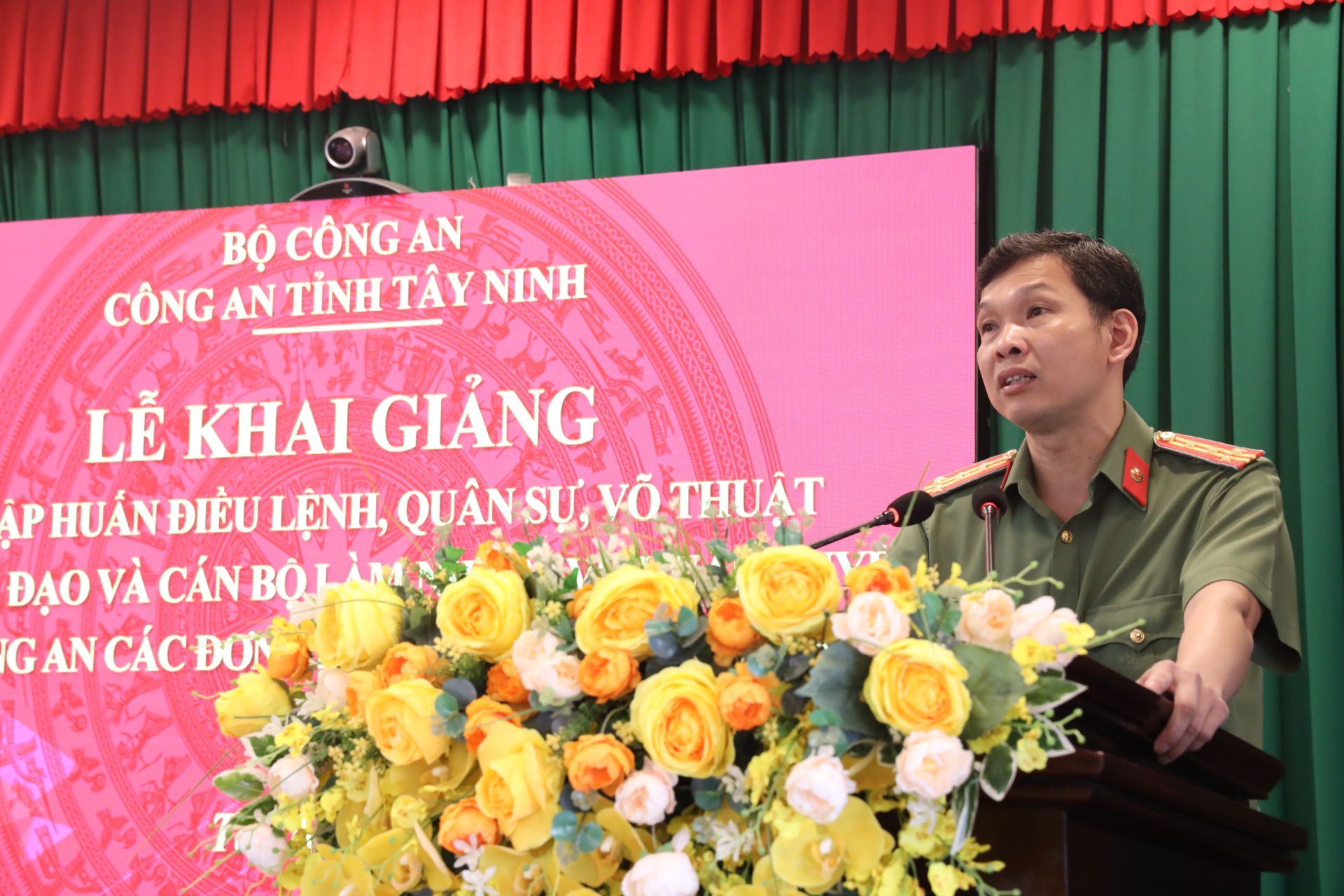 Phát biểu tại lễ khai giảng, Đại tá Tạ Văn Đẹp- Phó Giám đốc Công an tỉnh yêu cầu các học viên tích cực tập luyện nắm vững nội dung, thực hành thuần phục các động tác để lãnh đạo, chỉ đạo, tổ chức thực hiện công tác điều lệnh, quân sự, võ thuật ở đơn vị đạt kết quả tốt.