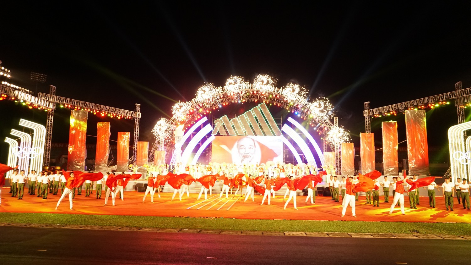 Khi ngọn đuốc về đến SVĐ, Chủ tịch UBND tỉnh Phạm Văn Tân châm vào đài lửa. Ngọn lửa sẽ được thắp sáng trong suốt thời gian diễn ra đại hội.
