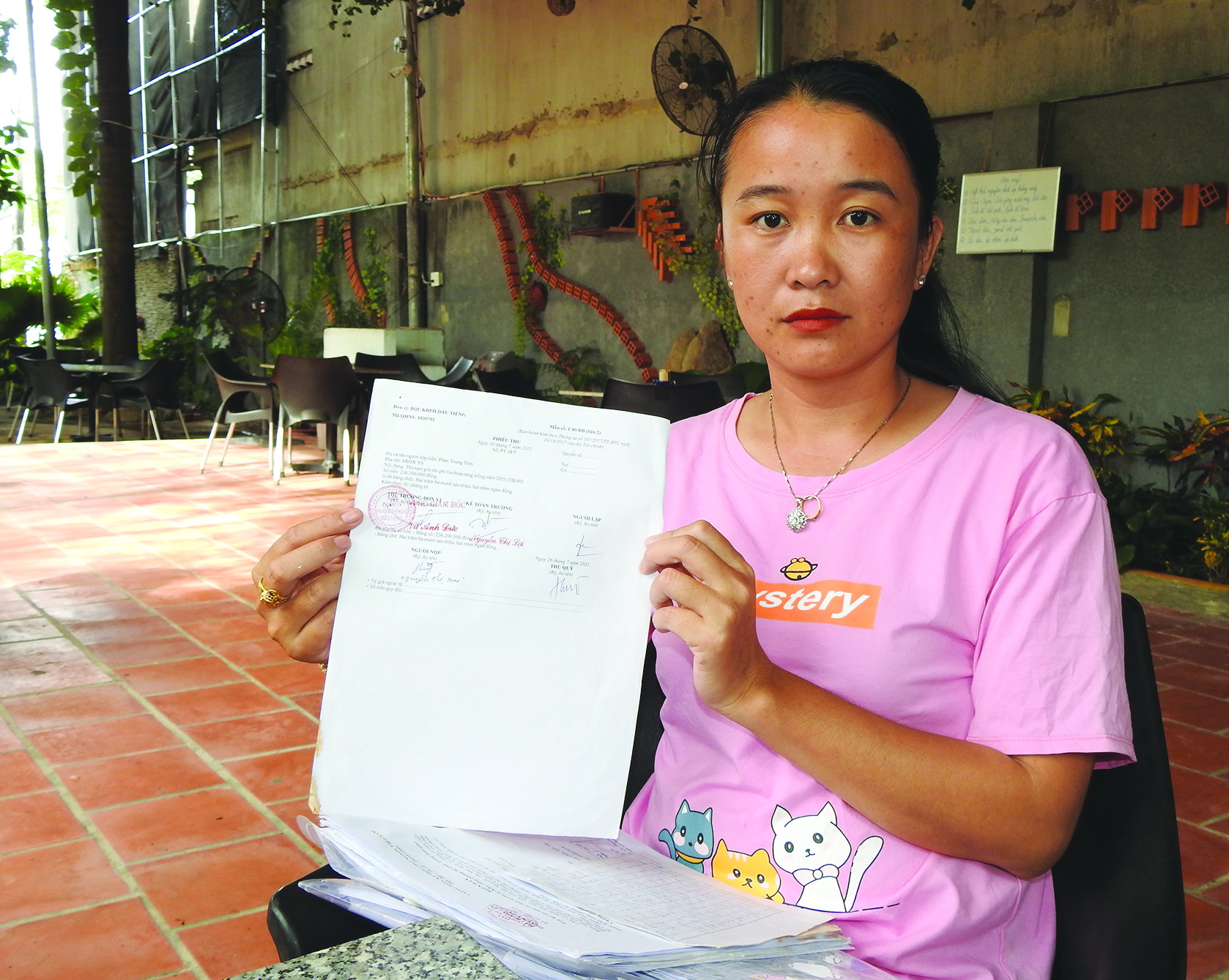 BQLRPH đã lập phiếu thu số tiền trên từ bà Mai. Đồng thời, Đội Quản lý, Bảo vệ và Phát triển rừng Suối Ngô cũng đã cấp giấy cho bà Mai được đưa phương tiện cơ giới vào khu rừng cây phụ trợ của ông Tiên để khai thác. Giấy này có thời hạn từ ngày 26.7 đến hết ngày 26.8.2021. Bà Mai đã thuê nhân công đưa máy cày, máy cưa đến khai thác cây.