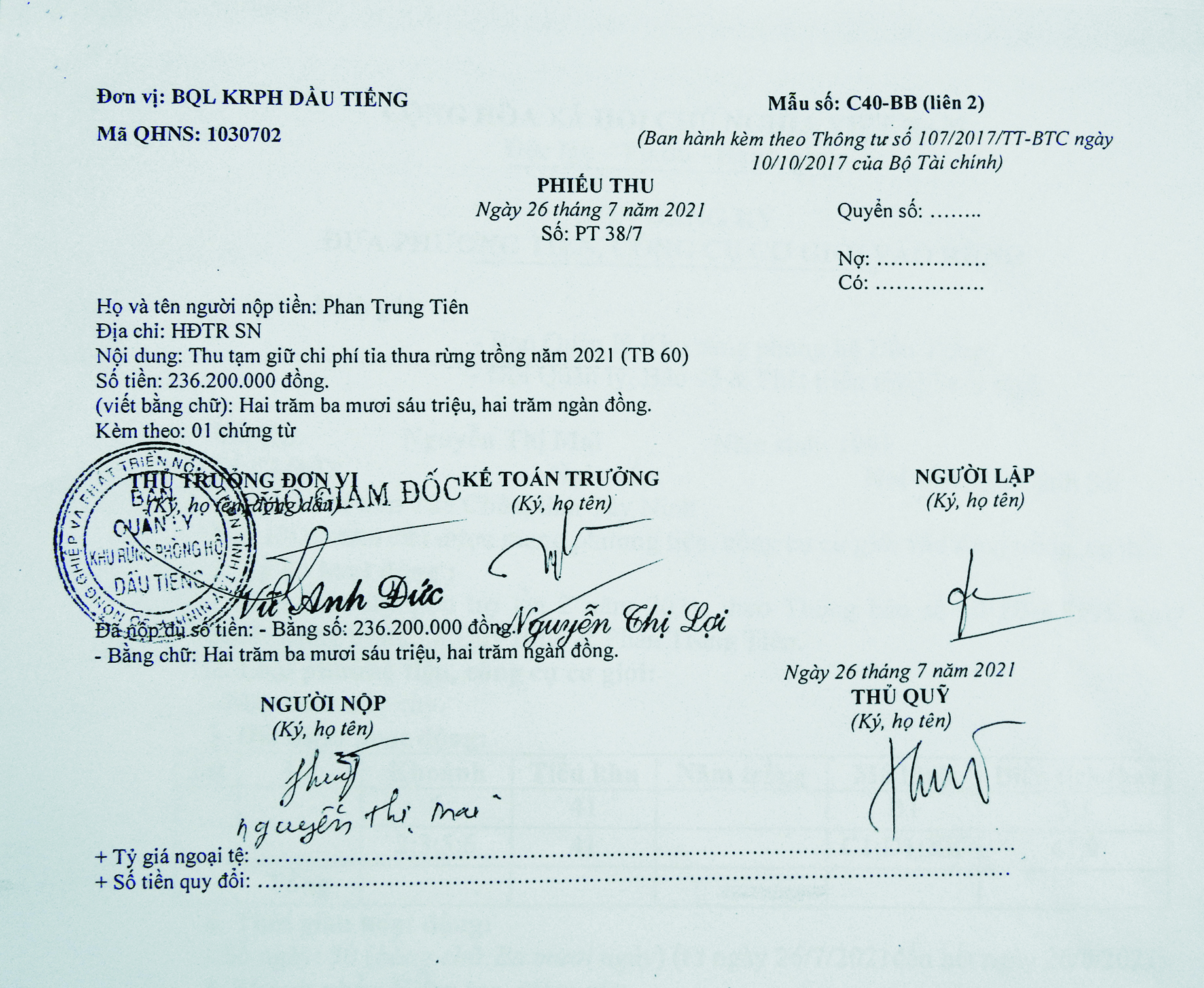 Phiếu thu phí tạm giữ tỉa thưa rừng trồng năm 2021 của BQLRPH (do bà Mai nộp tiền).