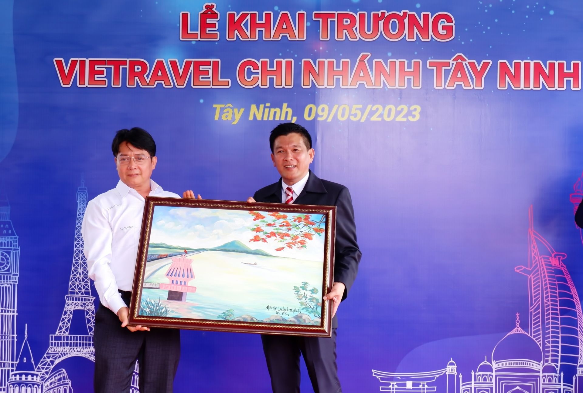 Ông Ngô Trần Ngọc Quốc–Chủ tịch Hiệp hội du lịch Tây Ninh tặng quà lưu niệm cho Chi nhánh Vietravel Tây Ninh nhân lễ khai trương chi nhánh tại Tây Ninh.