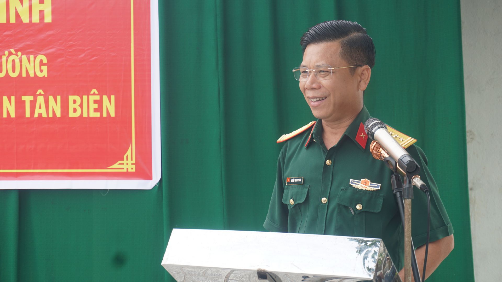 Đại tá Nguyễn Thanh Phong- Phó Bí thư Đảng uỷ quân sự - Chính uỷ Bộ CHQS tỉnh phát biểu tại lễ khánh thành công trình tại Thánh đường Al Mubarak.