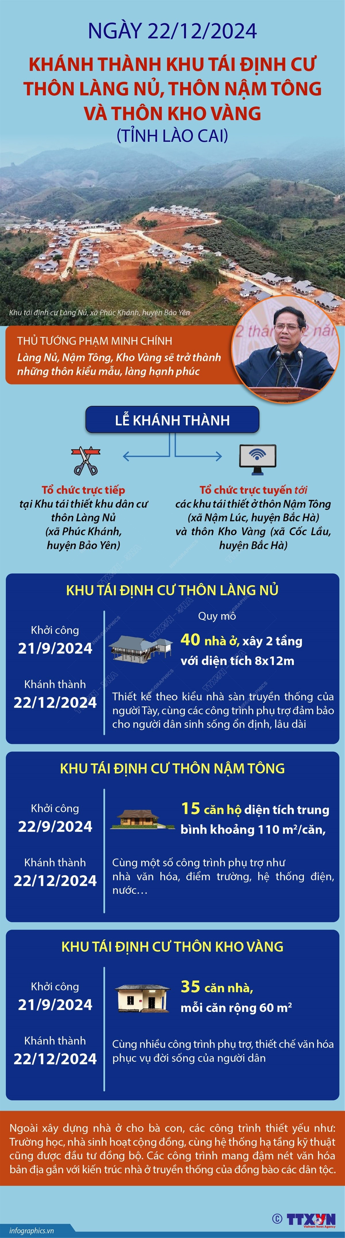 Sáng 22/12, tại Lào Cai, Thủ tướng Chính phủ Phạm Minh Chính dự Lễ khánh thành Dự án tái thiết khu dân cư thôn Làng Nủ, xã Phúc Khánh, huyện Bảo Yên; thôn Nậm Tông, xã Nậm Lúc và thôn Kho Vàng, xã Cốc Lầu, huyện Bắc Hà - nơi vào những ngày đầu tháng 9/2024 xảy ra thảm hoạ lũ quét, sạt lở đất do bão số 3 (Yagi) gây ra làm hàng chục người dân thiệt mạng và mất tích; hàng chục ngôi nhà vùi lấp, cuốn trôi.