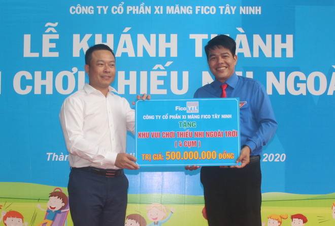 Ông Lê Đức Huy- Chủ tịch HĐQT Công ty Cổ phần Xi măng Fico Tây Ninh (trái) trao bảng tượng trưng tài trợ xây dựng khu vui chơi cho anh Lê Tấn Phát- Bí thư Thành đoàn TP.Tây Ninh.