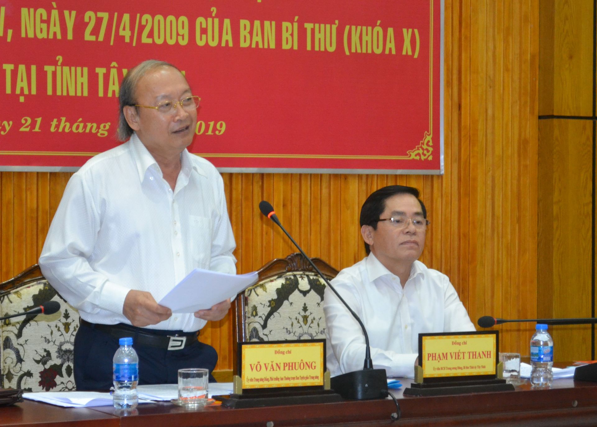 Chiều 21.3, đoàn công tác Trung ương do Phó trưởng Ban Thường trực Ban Tuyên giáo Trung ương Võ Văn Phuông làm trưởng đoàn có buổi làm việc với Tỉnh uỷ Tây Ninh, khảo sát kết quả 10 năm thực hiện Quyết định 221-QĐ/TW ngày 27.4.2009 của Ban Bí thư Trung ương Đảng về việc ban hành quy chế phối hợp giữa Ban Tuyên giáo các cấp với cơ quan quản lý Nhà nước cùng cấp trong việc triển khai kế hoạch phát triển kinh tế - xã hội, giải quyết những vấn đề bức xúc của nhân dân. Cùng đi có Thứ trưởng Bộ Thông tin - Truyền thông Hoàng Vĩnh Bảo và đại diện Bộ NN&PTNT, Bộ Y tế.