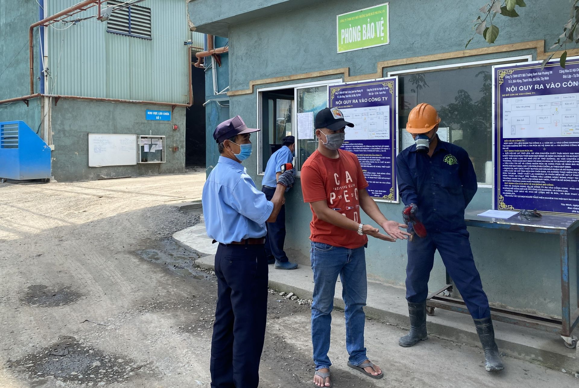 Tài xế vận chuyển rác vào Công ty Huê Phương phải kiểm tra thân nhiệt, khử khuẩn tay.