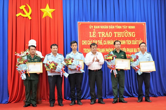 Chủ tịch Phạm Văn Tân đã trao bằng khen của UBND tỉnh kèm tiền thưởng cho 2 tập thể, 3 cá nhân thuộc các lực lượng Hải quan và Biên phòng Cửa khẩu quốc tế Mộc Bài. Đây là các đơn vị đã có thành tích xuất sắc, bắt giữ đối tượng vận chuyển 7kg ma túy đá nhập cảnh từ Campuchia vào Việt Nam tại khu vực Cửa khẩu quốc tế Mộc Bài vào ngày 5.7.2019 vừa qua.