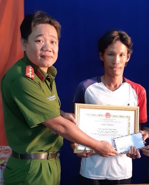 Ngày 7.1, tại UBND xã Thành Long, Ðại uý Phạm Thanh Liêm - Trưởng Công an xã Thành Long, huyện Châu Thành trao giấy khen của Chủ tịch UBND huyện Châu Thành cho anh Nguyễn Thanh Tuấn (SN 1984, ngụ ấp Nam Bến Sỏi, xã Thành Long) có thành tích cứu người bị đuối nước.